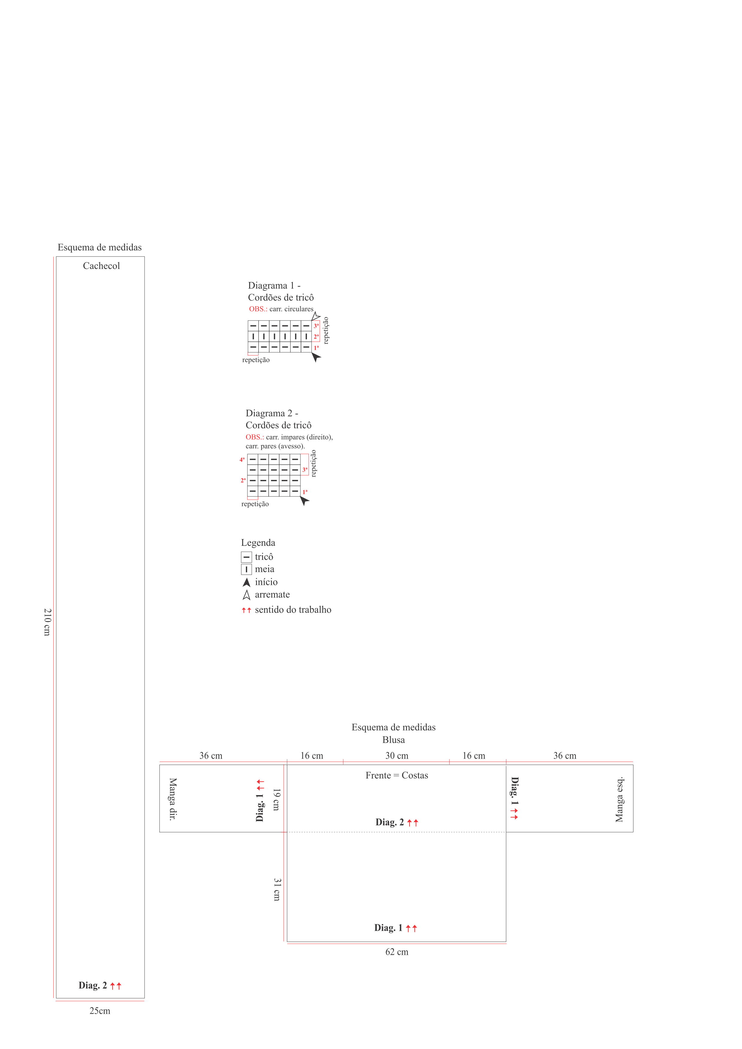 Pontos Utilizados: Cordões de Tricô (carr. circulares): siga o diag. 1; Cordões de Tricô (carr. ida e volta): siga o diag. 2 e ms. (mate simples): tire um p. sem fazer em m., 1 m., rem. o p. sem fazer sobre o tric.